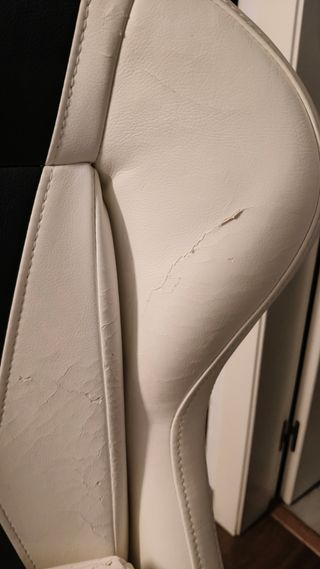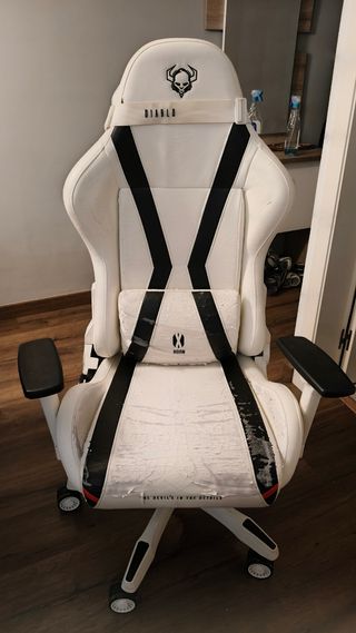 Silla de gaming Diablo color blanco y negro IMPORTANTE ESTADO PRODUCTO: MIRAR TODAS LAS FOTOS DEL ANUNCIO (silla muy pelada, puede perder algún trocito de piel sintética, muy usada). No se hacen envíos, recogida en mi portería