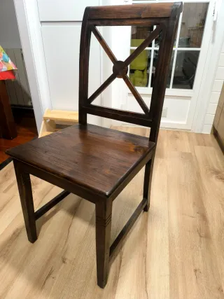 Conjunto de cuatro sillas de madera maciza con un diseño clásico y elegante. - Estructura robusta y duradera. - Respaldo con diseño de aspas. - Asiento cómodo y amplio.
