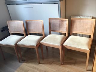 Conjunto de cuatro sillas modelo Manila de Andreu World. Su diseño combina la calidez de la madera con la textura del ratán. - Estructura de madera. - Asiento y respaldo de ratán. - Respaldo deteriorado por el uso en alguna silla.
