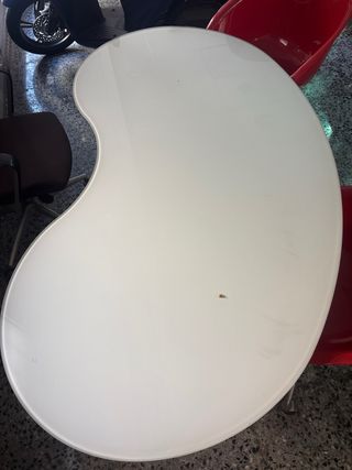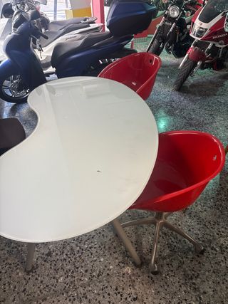 Conjunto de mesa con sobre de cristal blanco y dos sillas rojas. - Mesa con forma de riñón. - Sillas de diseño. - Base de las sillas con ruedas.