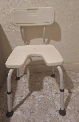 Silla de ducha diseñada para personas mayores o con movilidad reducida. Su asiento con forma de U facilita su uso. - Estructura metálica. - Asiento de plástico. - Patas ajustables en altura. - Con respaldo.