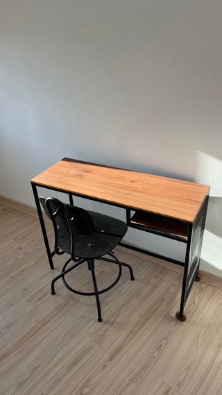 Conjunto de escritorio compacto y silla a juego. Ideal para espacios reducidos. Ancho 36 Largo 100 Alto 75 - Diseño moderno con estructura metálica. - Tablero de madera. - Silla con altura regulable.