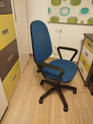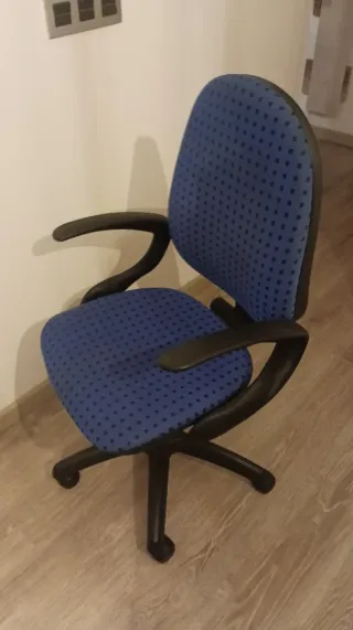 Silla de escritorio con ruedas. - Asiento y respaldo tapizados en tela. - Base de plástico con ruedas para fácil movilidad. - Brazos ergonómicos. Muy cómoda y funciona el gas de subir y bajar