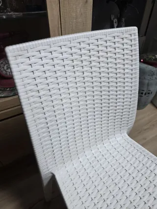 Conjunto de cuatro sillas con un diseño tejido que aporta un toque moderno a cualquier espacio. - Ideales para interior o exterior. - Acabado blanco.