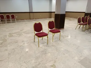 Conjunto de sillas de terciopelo rojo con detalles dorados. Se regalan los vestidos, blancos y granates - Estructura metálica. - Tapicería de terciopelo. Las sillas tienen bastantes años, están bien conservadas, siempre se han usado vestidas, hay vestidos para sillas granates y blancas, los regalo