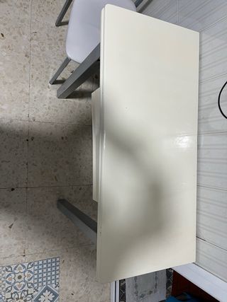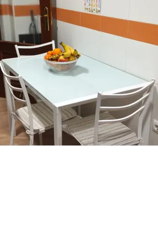 Conjunto de mesa de comedor extensible y cuatro sillas. Apenas se ha usado, está en muy buen estado. - Mesa blanca de diseño sencillo y elegante. - Cuatro sillas blancas a juego con la mesa. - Superficie de la mesa lisa y brillante. - Patas de madera resistentes.