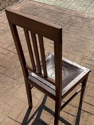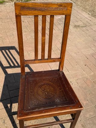 Silla antigua de madera, de principios de siglo. en madera con respaldo de palillería y asiento con piel repujada y decorada. En buen estado. Lote de siete sillas, se venden individual a 30 la unidad o en conjunto. Recogida en un pueblo de la provincia de Badajoz. Preguntar sin compromiso.