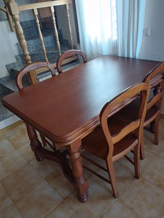 Conjunto de mesa de comedor con cuatro sillas a juego. Ideal para tu hogar. - Mesa con sobre de cristal. - Extensible - Estructura y sillas de madera. Precio negociable.