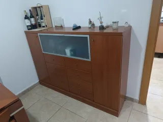 Conjunto de comedor con mesa de madera y cristal, acompañado de sillas a juego. - Mesa rectangular extensible con sobre de cristal. 160x90 // 220x90 - Juego de 4 sillas de madera. - Mueble aparador 160 ancho, 37 fondo, 108 alto. - Mesa de centro/sofá elevable 60x110 - Sofá chaise-long 245cm Precio negociable.