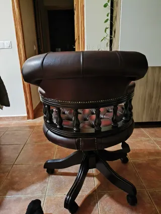 Elegante silla de escritorio de estilo vintage, con un acabado en piel de color burdeos y detalles capitoné. - Diseño clásico con brazos. - Base giratoria con ruedas. - Estructura de madera oscura.
