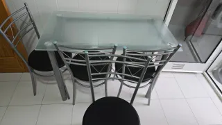 Conjunto de mesa de cocina con superficie de cristal y cuatro sillas a juego. Ideal para espacios compactos - Mesa de cristal.110x60cm - Estructura de las sillas metálica gris. - Asientos de las sillas en color negro de 40cm