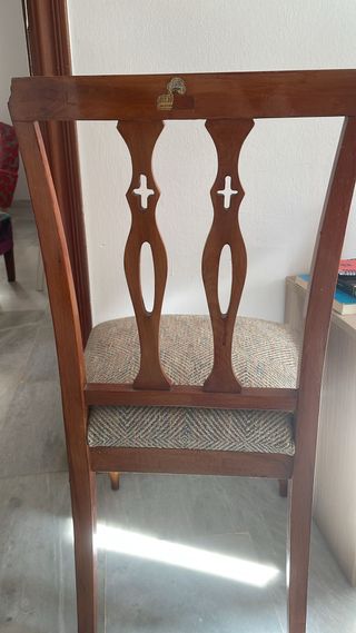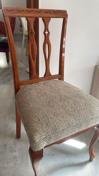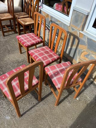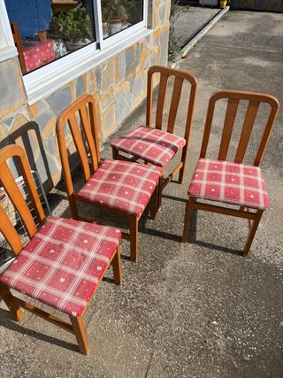Se venden cuatro sillas de madera con asientos tapizados. - Estructura de madera. - Tapicería de tela a cuadros. 15 euros kas 4 , son fuertes
