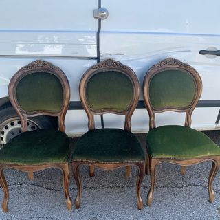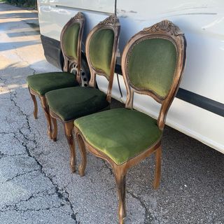 Conjunto de sillas con un diseño clásico y elegante, perfectas para añadir un toque de estilo a cualquier espacio. - Tapicería de terciopelo en color verde. - Estructura de madera con detalles ornamentales. - Patas curvas de estilo Luis XV.