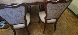 Elegante y funcional mesa de comedor de madera veteada en color caoba. - MADERA de toda la vida, nada de aglomerado ni similares. - Diseño clásico y funcional. - Patas robustas para mayor estabilidad. - Extensible por ambos lados 50cm. - Seis sillas en buen estado. La mesa está montada, el desmontaje y transporte será por cuenta del comprador.