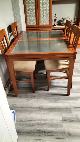 Conjunto de mesa de comedor con superficie de cristal y cuatro sillas, con sus respectivos rasguños por el paso del tiempo. Medidas mesa: ancho 70, largo 110, alto 75cm Sillas: ancho 40, alto 95cm. - Diseño moderno y elegante. - Patas de madera robustas. - Tapicería de las sillas en polipiel.