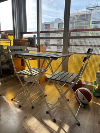 Conjunto de mesa y dos sillas TÄRNÖ de IKEA, perfecto para tu terraza o balcón. El diseño plegable facilita su almacenamiento. - Estructura de metal resistente. - Tablero y asientos de madera. - Completamente nueva