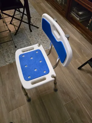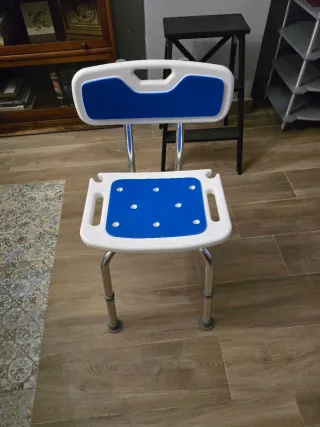 Silla de ducha marca Prim con respaldo, diseñada para mayor comodidad y seguridad. - Asiento y respaldo acolchada con espuma EVA en azul. - Patas ajustables en altura. - Estructura de metal y plástico resistente. - Dotado de agujeros de desagües y asaderos. - Se coloca dentro de la ducha. - Peso máximo 100Kg