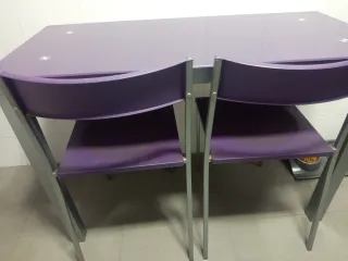 Conjunto de mesa de comedor con cuatro sillas a juego. La mesa tiene un diseño moderno con una franja decorativa en color rosa. - Mesa de comedor. - Cuatro sillas. - Diseño con franja rosa. Las sillas conservan el plastico de protección *Recogida en CIUDAD DE LOS ÁNGELES (MADRID)*