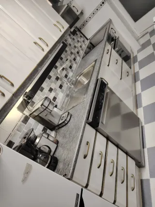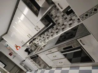 Conjunto de muebles de cocina en blanco brillante con detalles en gris, encimera rugosa, muy fácil de limpiar. Uno de los muebles es del altillo del frigorífico. La encimera mide 3,05 m Incluido fregadero y grifo extraíble de acero inoxidable, mesa de 1 metro de larga, 54 cm de ancha extensible a 90 cm y 4 sillas con respaldo. No incluye electrodomésticos