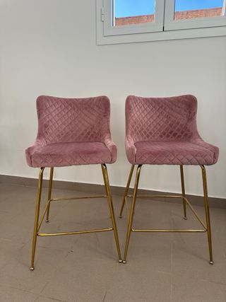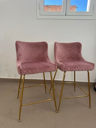 Elegante juego de dos sillas altas con un diseño moderno y sofisticado. - Tapicería de terciopelo en color rosa. - Patas metálicas doradas. - Diseño acolchado con rombos.