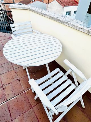 Conjunto de mesa redonda y dos sillas plegables para terraza. Son de madera y están pintadas en blanco. Están utilizadas y en algún trozo ha saltado la pintura pero a parte de eso están en buen estado y son resistentes. La mesa mide 92 de ancho por 75 de alto.