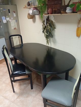 Conjunto de mesa de comedor extensible en color negro, acompañado de tres sillas. - Mesa con superficie lisa y forma ovalada. - Sillas con asientos tapizados y respaldos con detalles verticales.