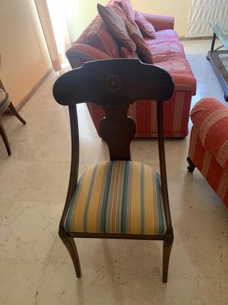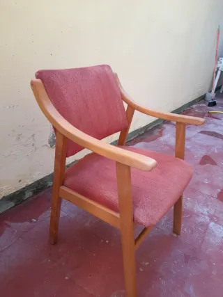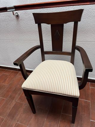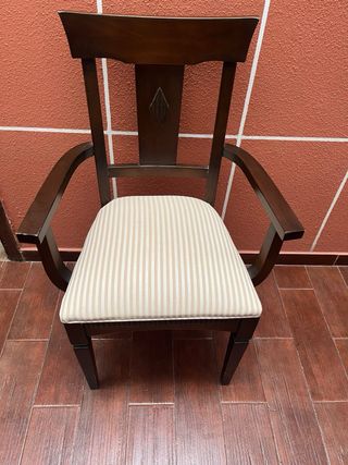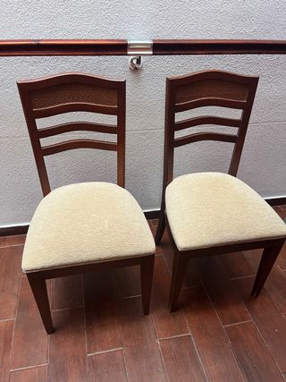 Se venden 4 sillas y 2 sillones, todo a juego. De madera de alta calidad y tapizadas. Precio de la silla=60€ Medidas silla: Ancho 45 cm Alto 93 cm Fondo 42 cm Precio del sillon=90€ Medidas sillon: Ancho 54 Alto 93 cm Fondo 50 cm