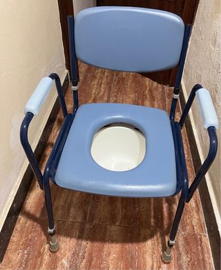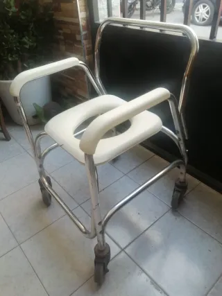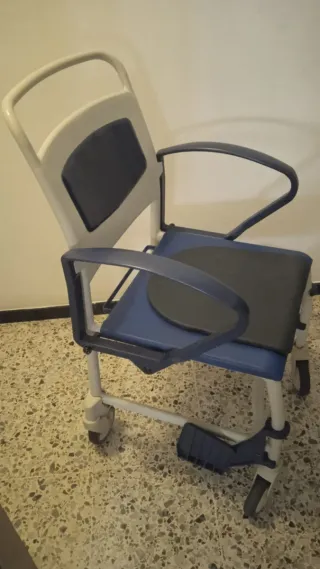 Silla de ducha y WC con ruedas, diseñada para facilitar la higiene y movilidad de personas con movilidad reducida pequeño fallo parte delantera pero hace su función perfectamente .. Cambio por leche papas aceite lo que sea,,, por un valor de 40€