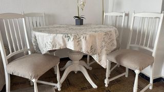 Mesa redonda blanca de madera capaz de hacerse mas grande - Sillas de madera pintadas en blanco. - Asientos tapizados en tela.
