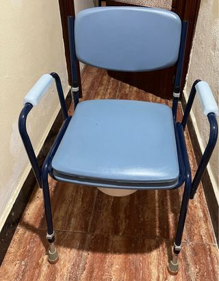 Silla de baño y WC con ruedas y cubo incluido. Su diseño permite su uso en la ducha o como silla de inodoro. - Estructura de aluminio. - Asiento acolchado y respaldo de plástico. - Ruedas con frenos para facilitar el desplazamiento y la seguridad. - Cubo extraíble. Diseñada en aluminio, resistente y liviana, con una capacidad de carga de hasta 158 kg. Es ergonómica, con asiento acolchado de 41 x 39 cm, reposapiés abatibles que facilitan las transferencias laterales.