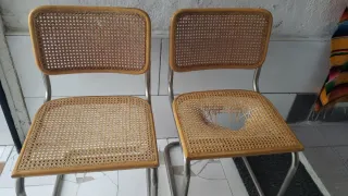 Conjunto de dos sillas con estructura metálica y asiento y respaldo de mimbre. - Diseño moderno y ligero. - Ideal para cualquier espacio. - Una de las sillas tiene un desperfecto en el asiento.se vende el lote o x separado