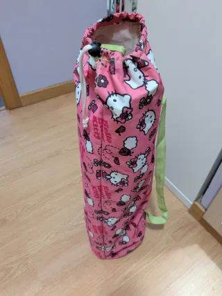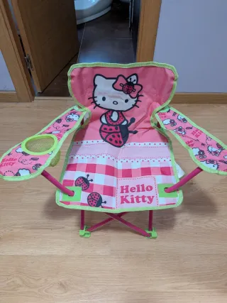 Adorable silla plegable con diseño de Hello Kitty, perfecta para los más pequeños. Ideal para camping, playa o para tener en el jardín. - Estructura resistente y ligera. - Divertido estampado de Hello Kitty y mariquitas. - Reposabrazos con portavasos. - Bolsa transportadora