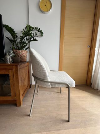 Se venden cuatro sillas de comedor con un diseño moderno y elegante. - Tapicería de tela en color beige. - Patas metálicas finas y resistentes. - Se venden por mudanza. - Tienen poco más de un año y no se han usado apenas.