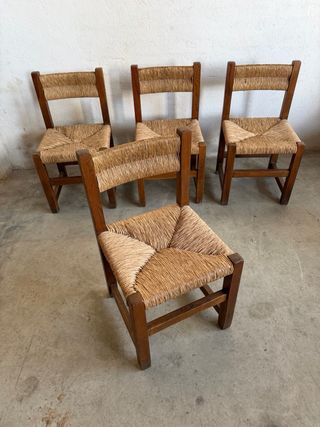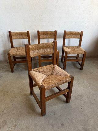 Conjunto de sillas con un diseño rústico y natural. U/€ - Estructura de madera oscura. - Asiento y respaldo de yute tejido. - Estilo artesanal.