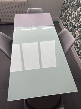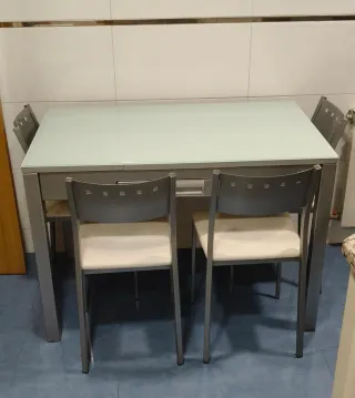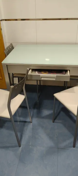 Conjunto de mesa de cocina con superficie de cristal y estructura metálica, acompañado de cuatro sillas. - Mesa con diseño moderno. - Sillas con asientos cómodos. - Elegante mesa de cocina con tablero de cristal blanco y estructura metálica en tono gris, acompañada de 4 sillas a juego. Conjunto moderno, sólido y muy fácil de limpiar, ideal para cocinas actuales. Incluye cajón central integrado, muy práctico para cubiertos o menaje. Todo el conjunto está en muy buen estado, cuidadosamente mantenido y listo para usar. 📏 Medidas de la mesa: • Largo: 110 cm • Ancho: 70 cm • Alto: 76 cm ✔ Diseño actual ✔ Materiales resistentes
