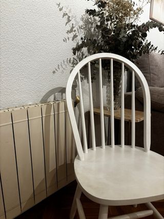 A la venta hasta finales de enero, momento en que se venderá la casa donde están. También se vende aparte la mesa a juego. Conjunto de cuatro sillas de los años 60, cuya tapicería ha sido actualizada hace unos 5 años. - Tapizado en tela con rayas rosas y detalles florales. - Respaldo con diseño geométrico. - Madera oscura vetada. - Diseño vintage. - En muy buen estado, sin roces reseñables. Han sido las típicas sillas "para cuando venían invitados", no han tenido uso habitual. Recogida en la zona Diego de León de Madrid.