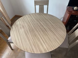 Conjunto de comedor con mesa redonda, cuatro sillas y alfombra. - Mesa con sobre de madera. Diámetro 1.05cm. - Sillas de plástico. - Alfombra redonda.