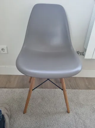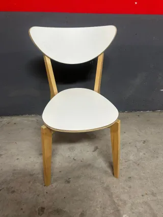 Conjunto de sillas con un diseño moderno y patas de madera. - Asiento de plástico blanco. - Patas de madera natural. - Estructura de soporte negra. 30€ por silla si te llevas las 8 por individual a 35€