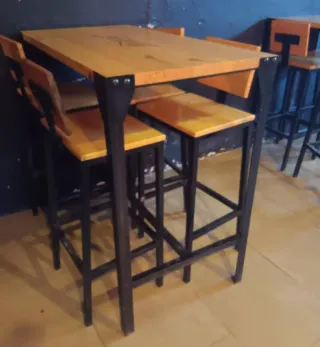 Conjunto de mesa alta y cuatro sillas de la marca Alhambra. Ideal para espacios modernos. - Mesa con superficie de madera. - Estructura metálica negra. - Sillas con asientos y respaldos de madera.