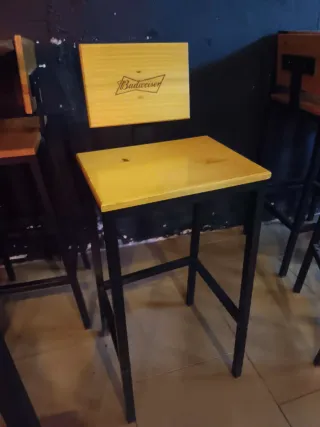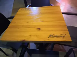 Mesa de madera con el logo de Budweiser grabado. - Diseño rústico y elegante. - Ideal para bares o espacios temáticos.