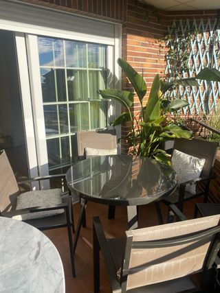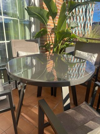 Conjunto de mesa y cuatro sillas para exterior. - Mesa con sobre de cristal. - Estructura de metal. - Sillas con asiento y respaldo de tela. la funda de los cojines la puedo dar (están un poco desgastadas del sol) la mesa y las sillas están perfectas mesa: 90x90x73 silla: 57x50x90