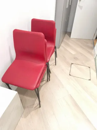 Conjunto de cinco sillas tapizadas en un vibrante color rojo. Su diseño moderno las hace perfectas para cualquier espacio. - Estructura metálica. - Tapicería de polipiel. - Perfecto estado, casi sin uso El precio es por Unidad