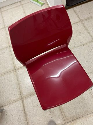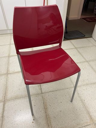 Conjunto de cuatro sillas de diseño moderno, una de ellas con una raja - Asiento y respaldo en plástico rojo brillante. - Patas metálicas en color gris. - Una de las sillas presenta un defecto.