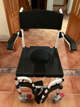 Vendo silla de baño/ducha con ruedas, ideal para personas con movilidad reducida. Asiento con tapa y orinal extraíble (tipo cómoda) para usar como WC portátil. Tiene respaldo, reposabrazos abatibles y 4 ruedas con freno para mayor seguridad. Se pliega para guardarla o transportarla con facilidad.