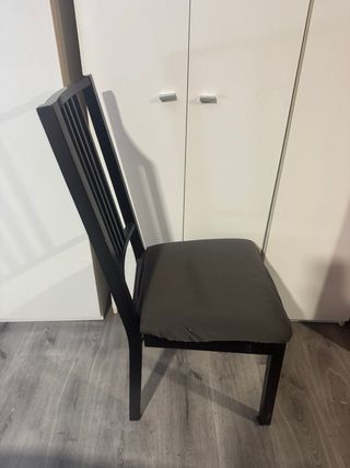 Se venden 4 sillas de comedor modelo BERGMUND de IKEA. Son cómodas y elegantes, perfectas para cualquier hogar. Como nuevas, a menos de la mitad de precio que en la tienda y... ¡ya están momtadas! 😁 - Tapicería de tela gris y patas de madera negra. - Color gris oscuro. Con la mesa que se ve (de IKEA, modelo TARSELE, extensible hasta 8 comensales) todo el conjunto 320€. Recogida en Majadahonda.