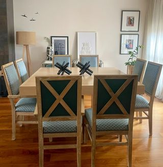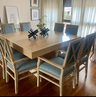 Conjunto de ocho sillas de comedor, fabricadas en madera de roble con un diseño elegante y moderno. Son de El Corte Inglés. Perfectas para dar un toque de estilo a tu hogar. - Estructura robusta de madera de roble. - Tapicería de tela en tonos azules y marrones. - Respaldo con detalle de cruces de madera.