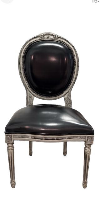 Elegante silla de estilo isabelino con un diseño clásico y refinado. - Tapicería en charol negro - Estructura de madera con acabado plateado. - Detalles ornamentales en el respaldo y las patas. *Precio por unidad* Disponible 6 unidades