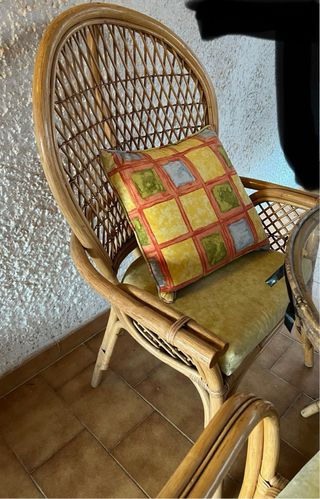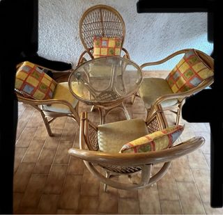 Mesa redondade bambú con cristal y sillas de bambú, dos sillas de cada tipo como se ve en las fotos. Cojines incluidos. Medidas exactas próximamente.