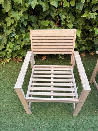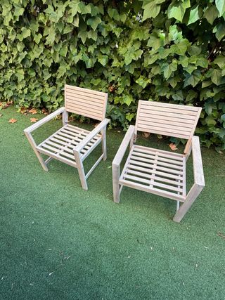 Conjunto de dos sillas de madera, perfectas para tu espacio exterior. Su diseño de listones las hace muy atractivas. - Estructura robusta de madera. - Respaldo y asiento con diseño de listones. Una de ellas tiene una pequeña rotura que hace que el respaldo se tambalee. se puede arreglar