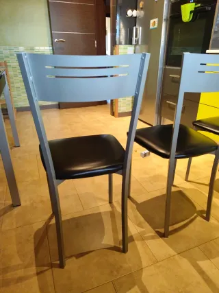 Conjunto de tres sillas modernas, perfectas para tu cocina o comedor. - Asientos cómodos y resistentes. - Diseño elegante y funcional. - Todas las sillas están en buen estado, excepto una que está un poco dañada, por ello se ha rebajado el precio.